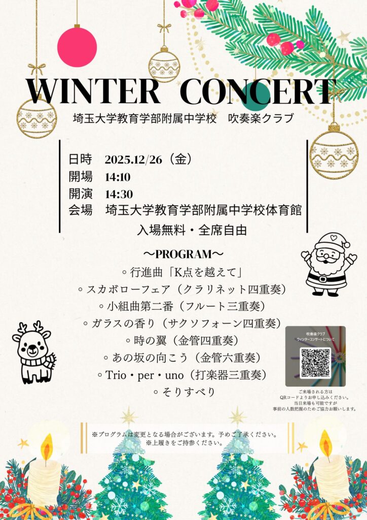 チラシデザインから準備等全てを子どもたちが行っている演奏会で、各チームによるアンサンブルとこの時期にちなんだ合奏などを3曲。最近クラブに加入してくれた小学生も初舞台となります。