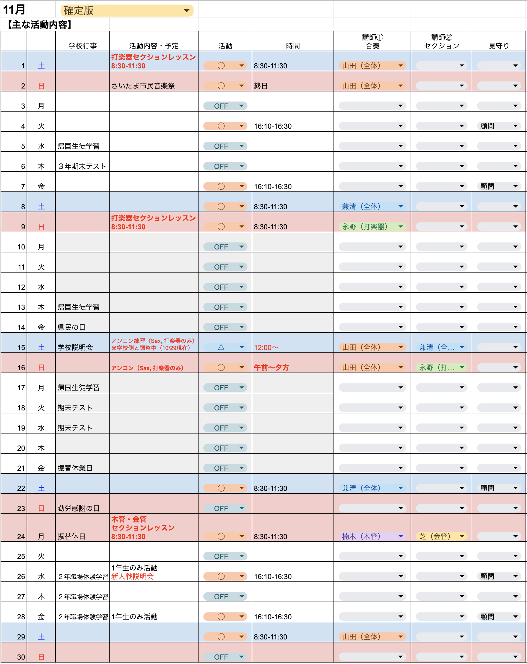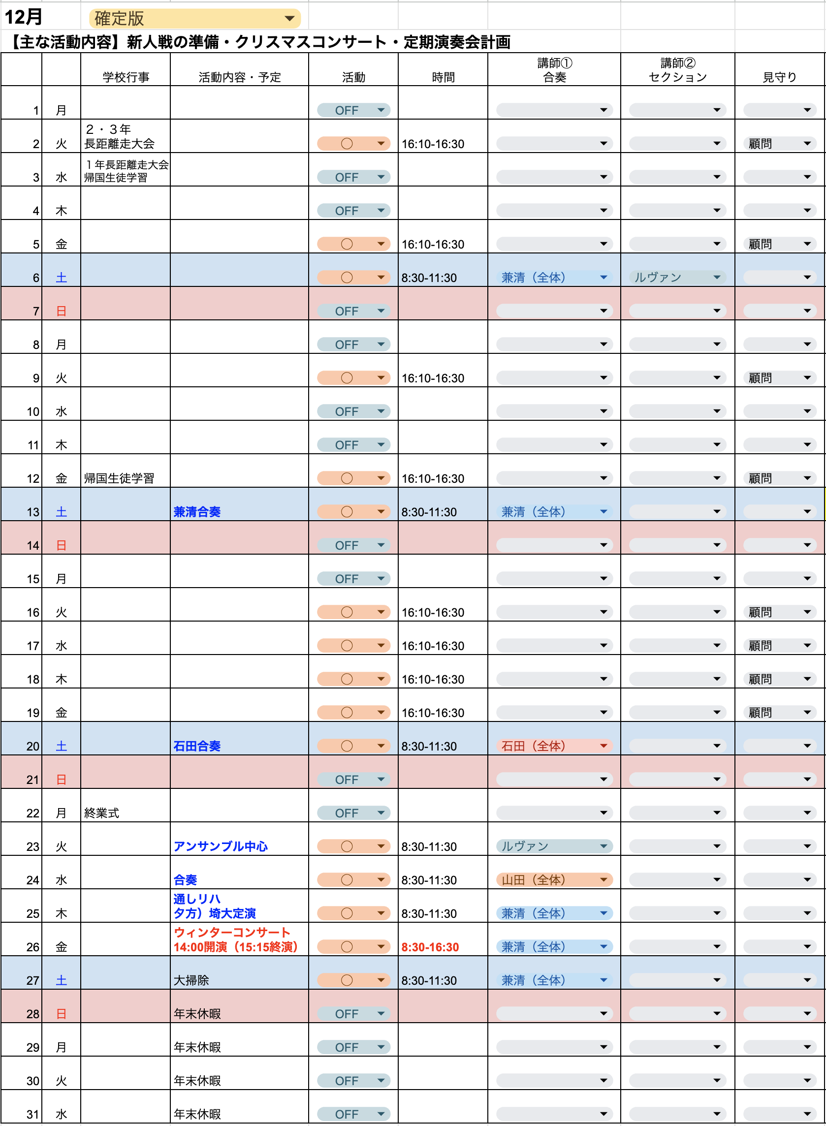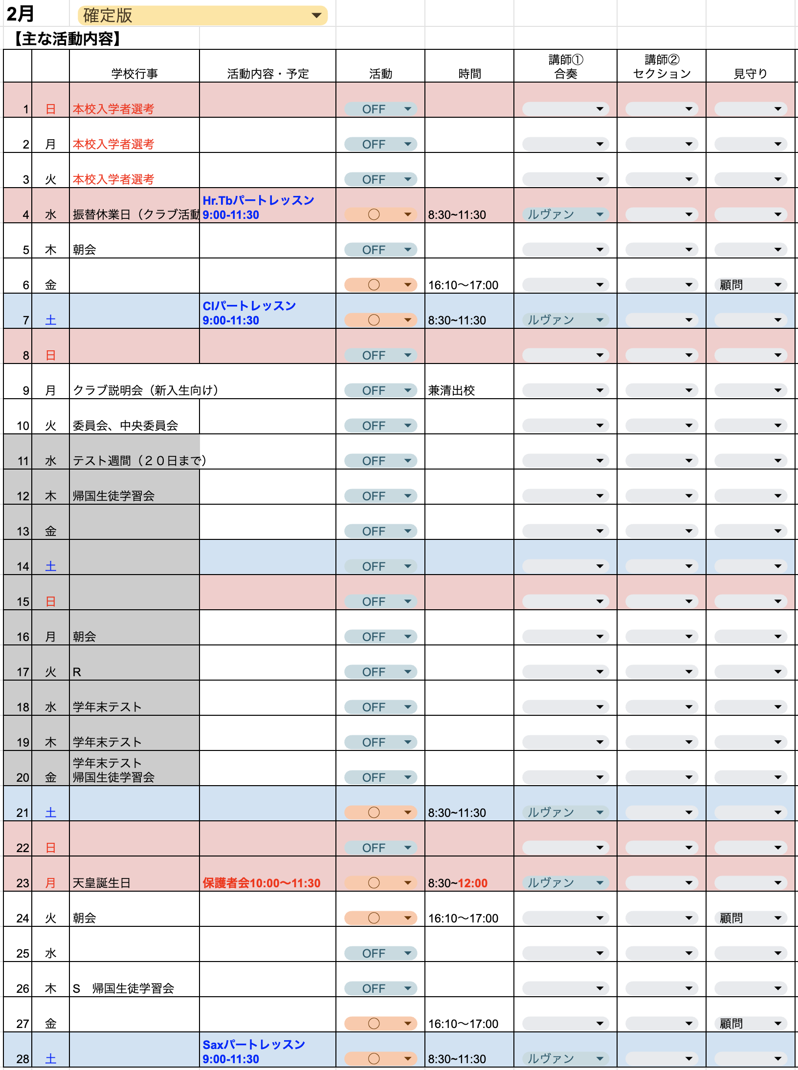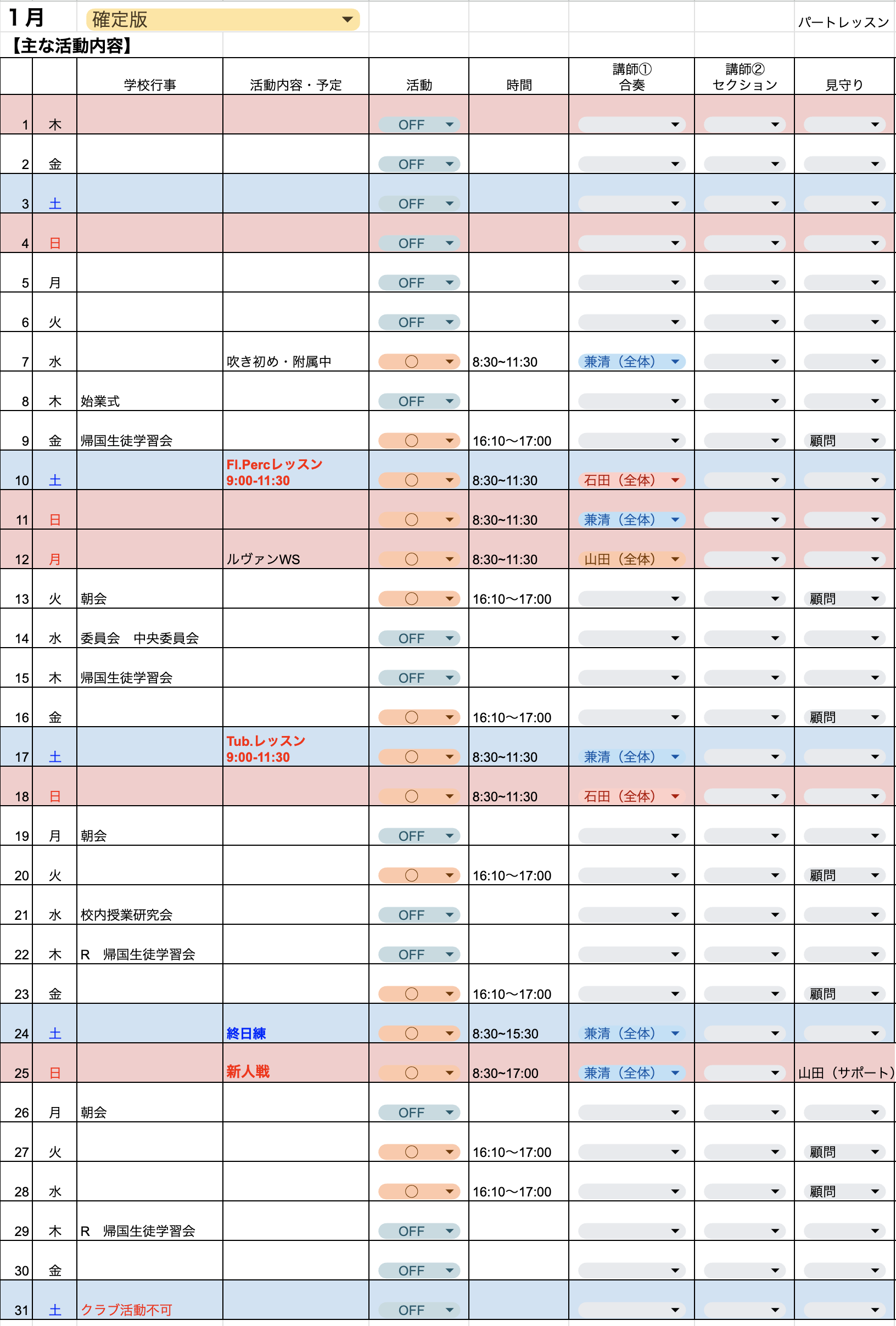ルヴァン・クラブの活動スケジュールです。体験レッスンなどにお越しの際は下記スケジュールをご参考の上お越しください。体験レッスンは原則土曜日・日曜日など休日の活動にお越しください。