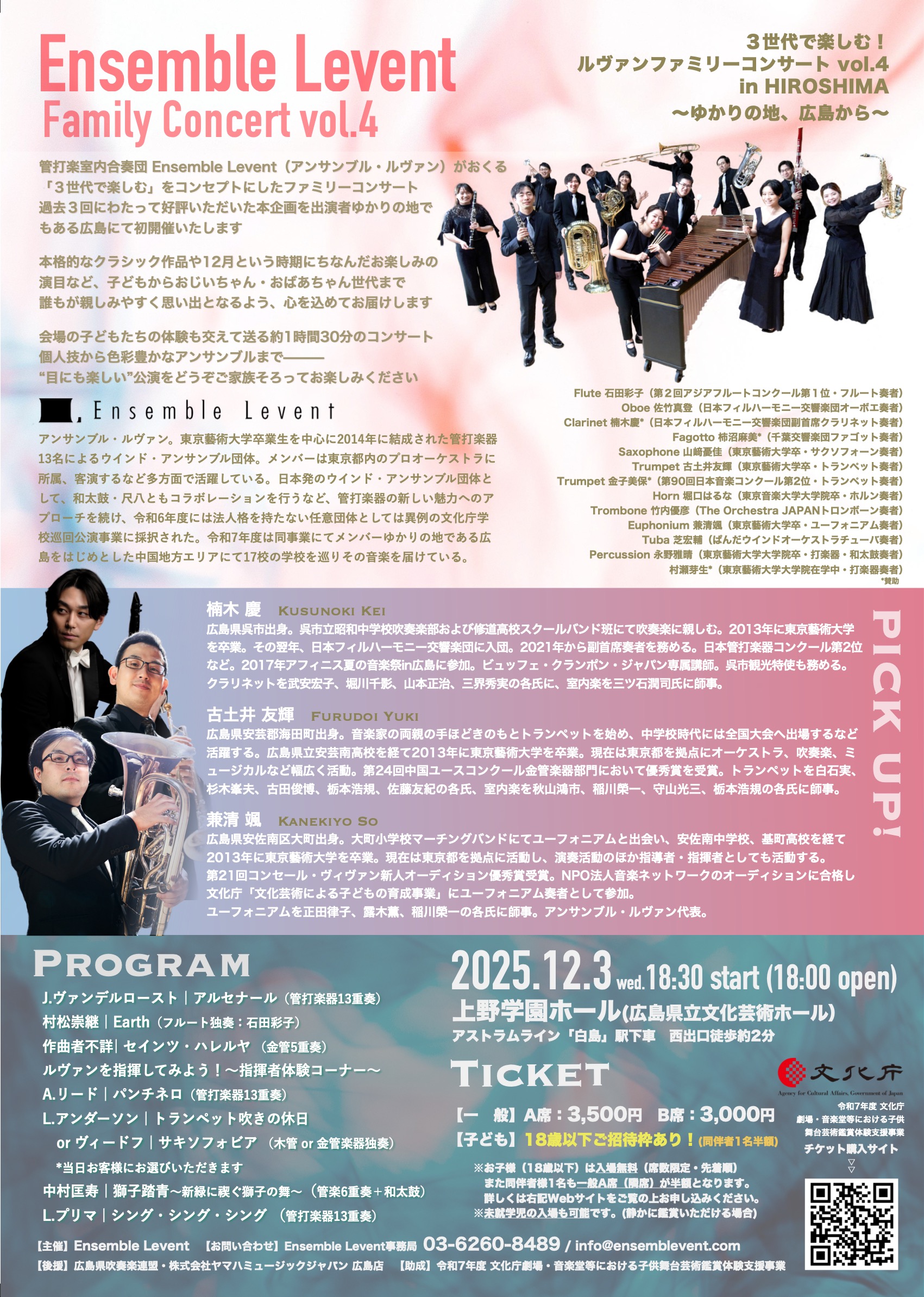 管打楽室内合奏団Ensemble Levent(アンサンブル・ルヴァン)が送る家族(3世代)で楽しむことのできるファミリーコンサート。